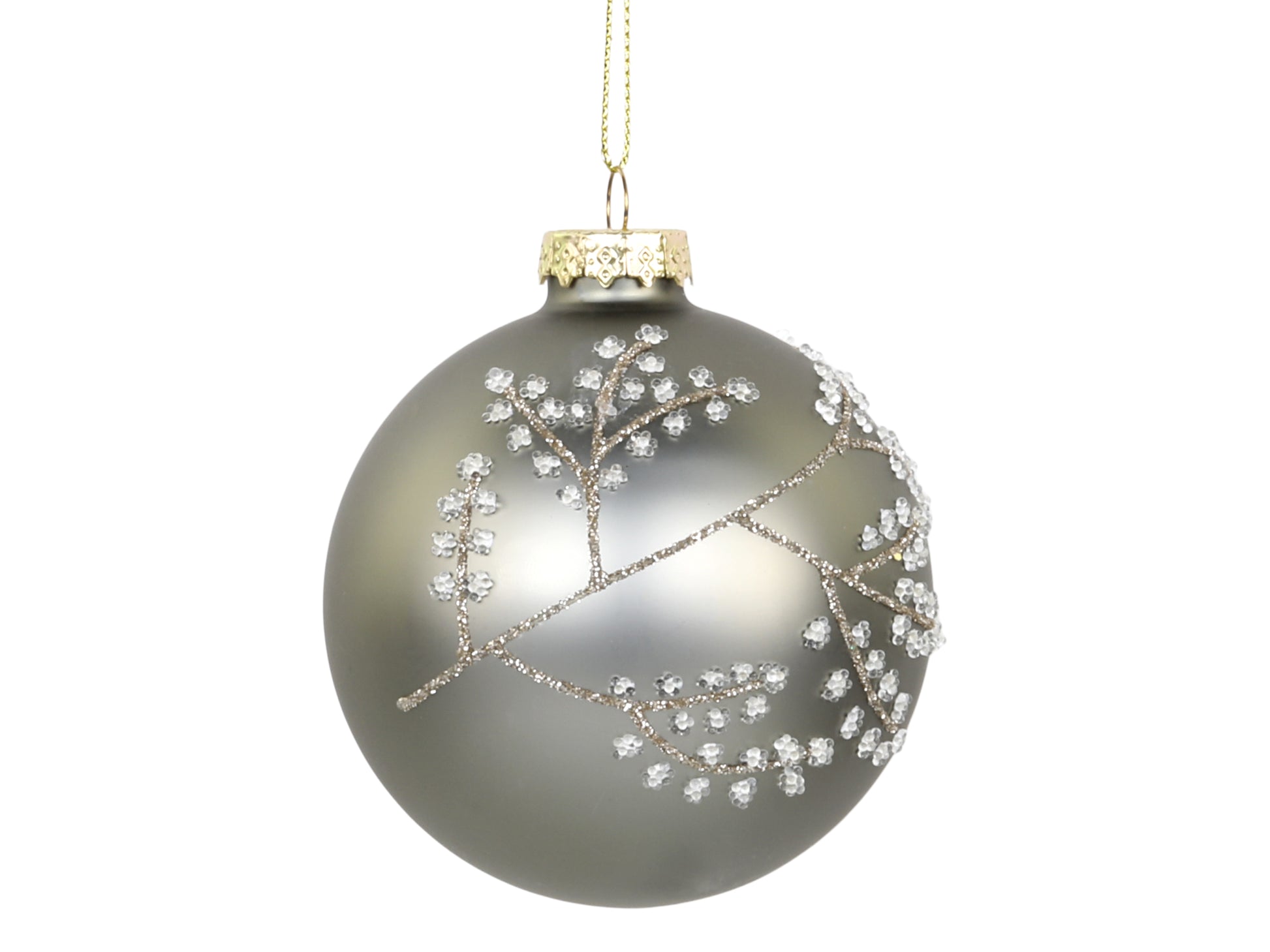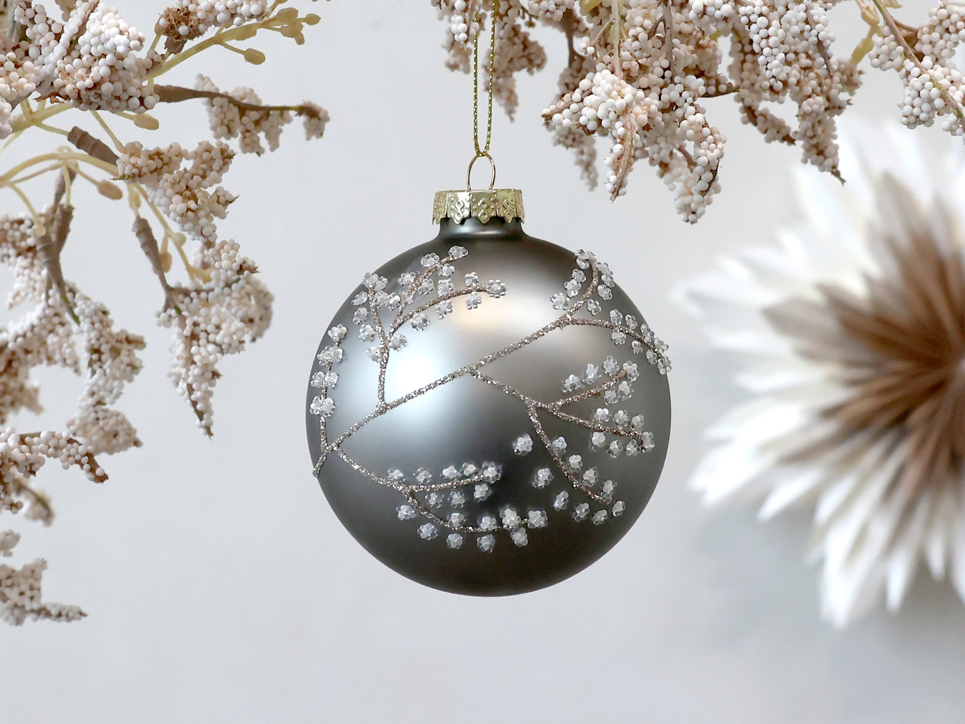 A beautiful pearlised Silver/Grey Bauble with glitter branch detail.