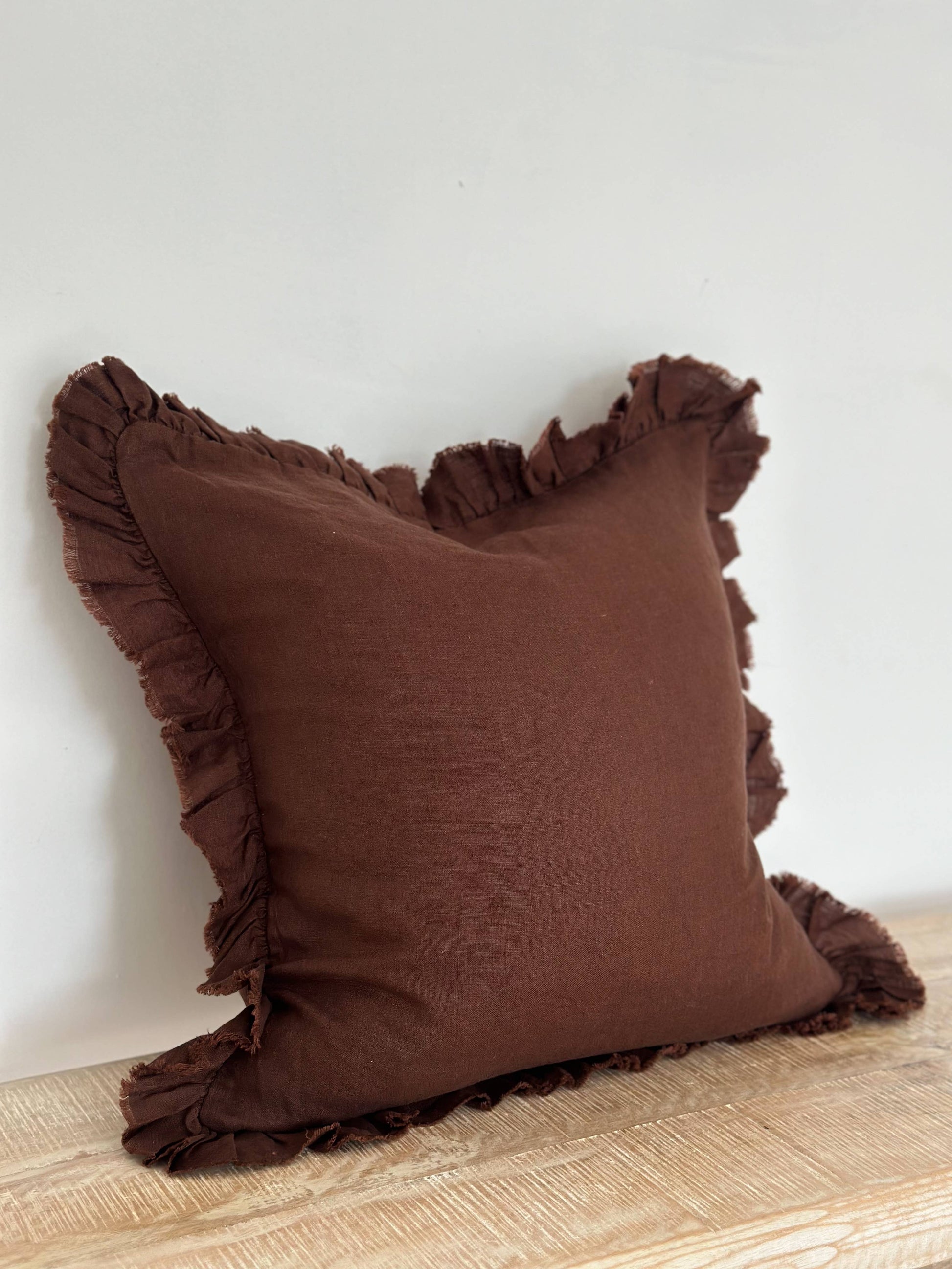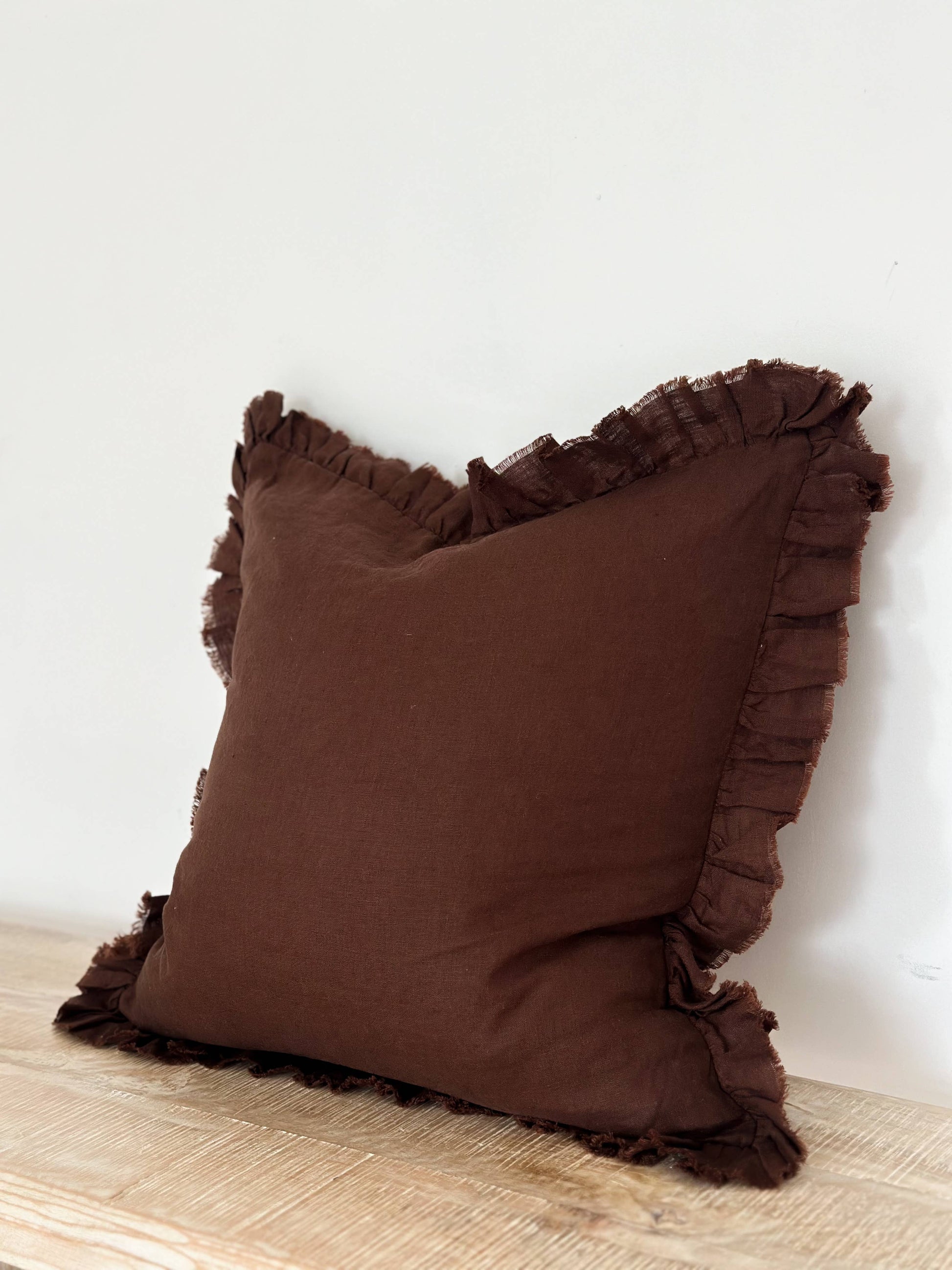 Hallie Ruffled Linen Cushion – Dark Brown: 45 x 45 cm