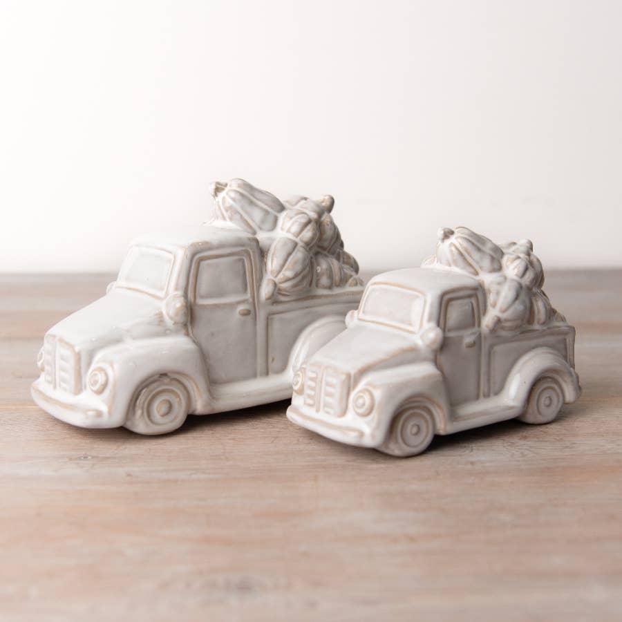 An adorable ceramic pumpkin filled trailer with a natural reactive glaze.